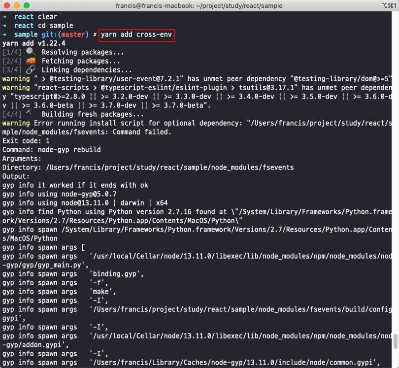 cross-env는 OS에 상관없이 환경변수를 정의하게 해주는 라이브러리입니다. 환경이 macOS라 그냥 cross-env 부분만 삭제하고 실행해도 상관없는데 그래도 다른환경 고려하여 설치를 하고 다시 실행해보겠습니다.
