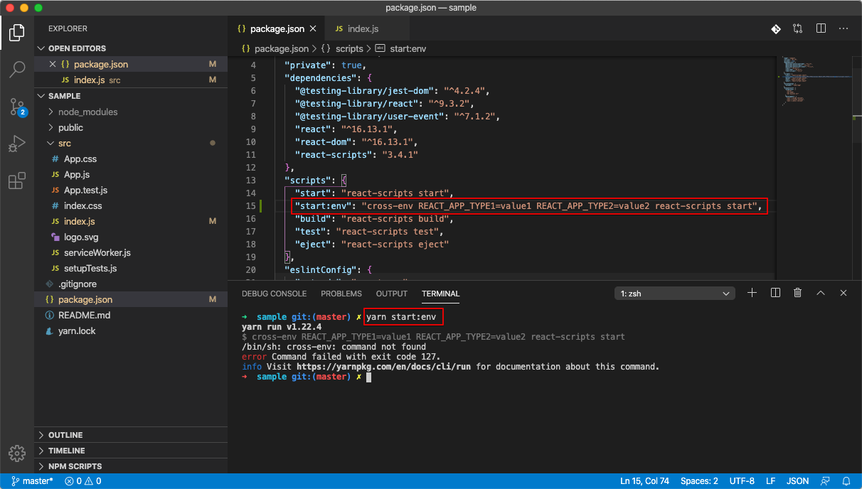 "start:env": "cross-env REACT_APP_TYPE1=value1 REACT_APP_TYPE2=value2 react-scripts start",